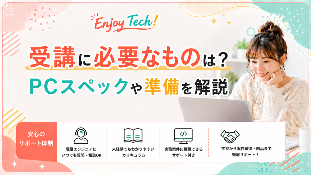 Enjoy Tech!の受講を検討しているけれど、「Enjoy Tech! 必要なもの」を事前にすべて揃えられるか不安に感じていませんか?特に未経験からプログラミングの世界へ飛び込む際は、パソコンのスペックや事前の知識など、準備不足で挫折してしまうことが一番怖... -